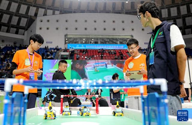 10月3日,在河南省济源市举行的全国青少年科技体育大赛上,参赛选手在进行机器人足球比赛。