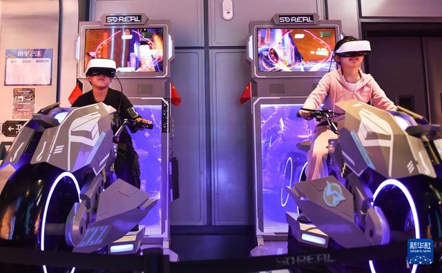 10月4日,在河南省洛阳市涧西区未来城科幻乐园内,孩子们在体验VR虚拟技术沉浸式场景。