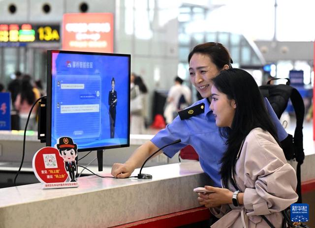 10月5日,在河北石家庄火车站候车大厅服务台,旅客向“AI智能客服机”问询旅行信息。