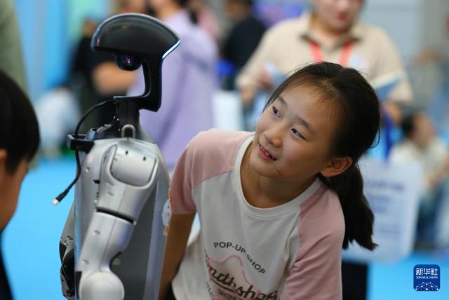 10月2日,在山东省第九届滕州书展现场,小朋友与机器人互动。