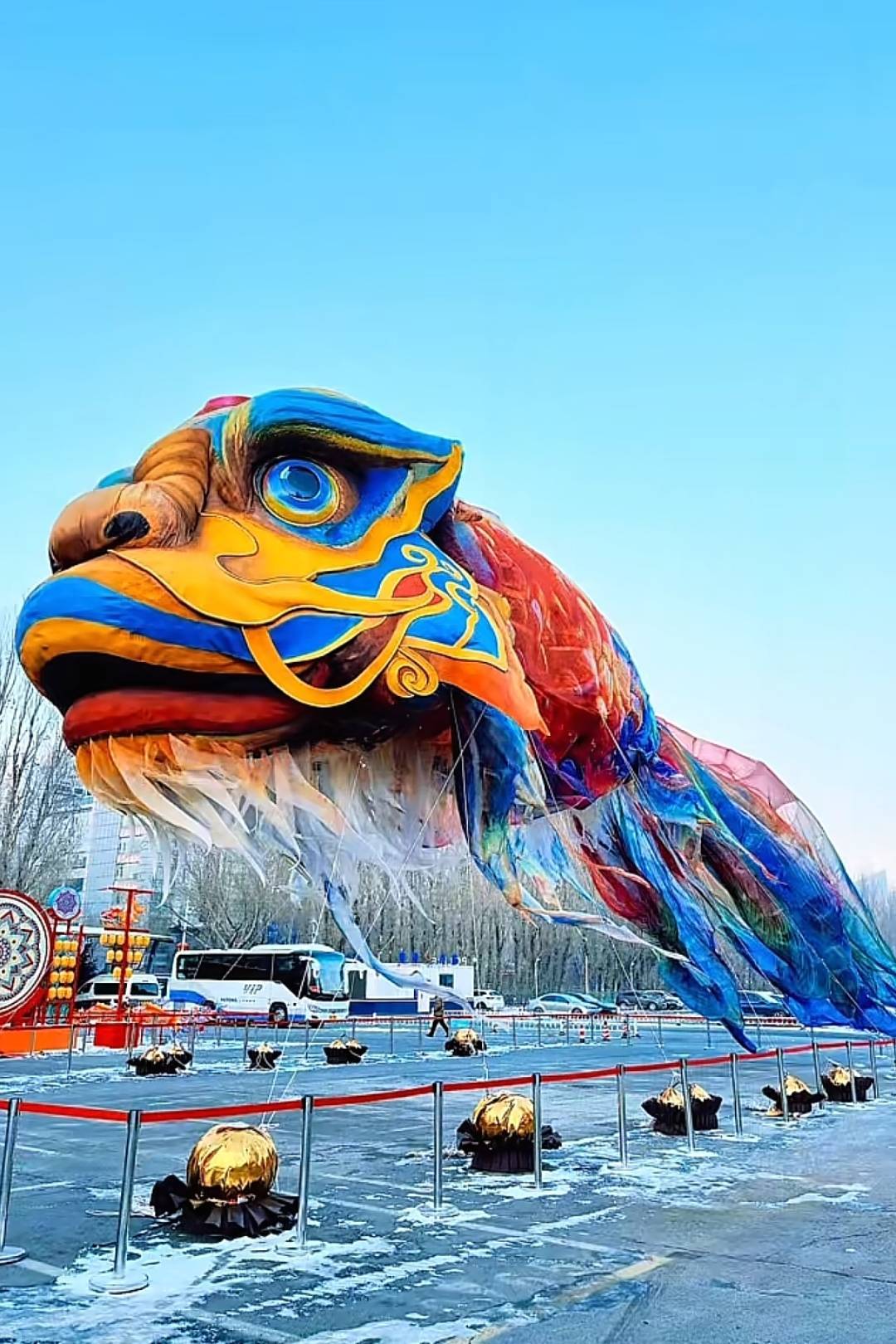 近日,有网友反映,哈尔滨市南岗区龙塔广场展示了巨型鳌鱼花灯景观,鳌鱼由龙头和彩色的鱼身构成,尾部随风飘荡,充满仙气。1月29日,制作鳌鱼花灯景观的相关负责人介绍,该鳌鱼花灯系非遗展示,长30米,高度和宽度均为8米,制作历时两个多月,每天固定时段进行展览,欢迎游客免费参观。