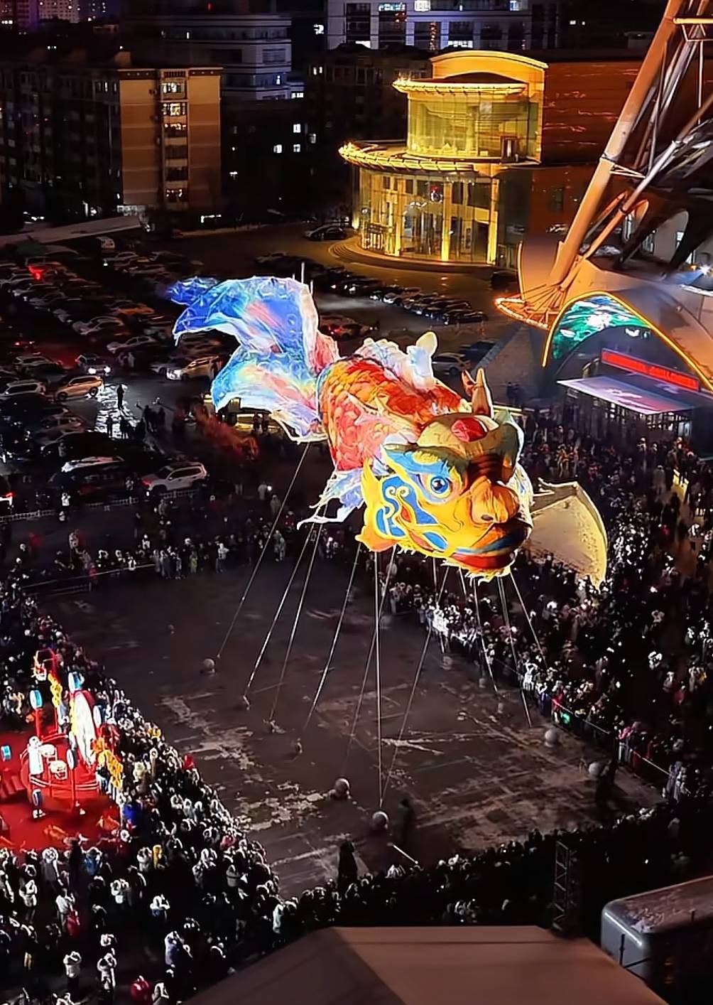 网友拍摄的视频显示,城市的一处广场空地上展示了一个悬空的巨型鳌鱼花灯,鳌鱼的身体由多根绳索固定在地面,鳌鱼的头部是黄色和蓝色相拼的龙头造型,鱼身和尾部的鳞片布满了多种颜色,尾部随风飘浮。整体形似锦鲤,较为壮观,一旁有市民和游客驻足拍照。
